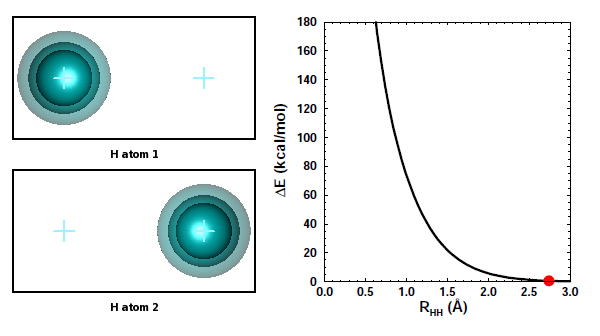 The orbitals look quite different when they cannot overlap. There is a nodal plane at the midpoint between the two nuclei that can't be crossed when the electrons on hydrogen have the same spin. The potential energy drives up the repulsive wall when the atoms are pushed together. This animation scans separations from 1 Å to nearly 3 Å, which raises the energy by about +140 kcal/mol. | ||||||||||||||||||||||||||||||||||||||||||||||||||||||||||||||||||||||||||||