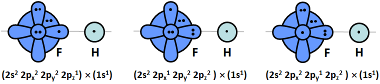 Bound HF occurs when the two singly occupied orbitals are aligned on the internuclear axis (the z-axis here) and their spins are antiparallel. The coupling diagram for HF as formed from the atoms is: | ||||||||||||||||||||||||||||||||||||||||||||||||||||||||||||||||||||||||||||