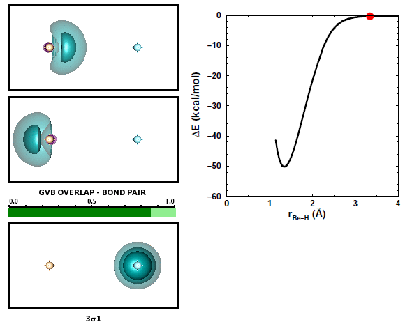 The changes are quite dramatic. At large separations, one sees the lobe orbitals on beryllium in the top two frames and the hydrogen 1s orbital in the bottom frame. As the nuclei approach one another, the inner beryllium lobe orbital polarizes toward hydrogen nucleus. Meanwhile, the other two orbitals are essentially swapping with each other. The top two frames always show which orbitals are coupled together. At long separations, there is an atomic pair on beryllium. At short separations, the inner Be lobe orbital is coupled to the 1s orbital on hydrogen to form a bond pair. Note that the GVB overlap varies between about 0.6 and 0.75: there is always a coupled electron pair—it just changes character with r. The lower frame shows which orbital is not coupled to another orbital. At large separations, it is the hydrogen 1s orbital; at short separations, it is the outer beryllium lobe orbital. | ||||||||||||||||||||||||||||||||||||||||||||||||||||||||||||||||||||||||||||