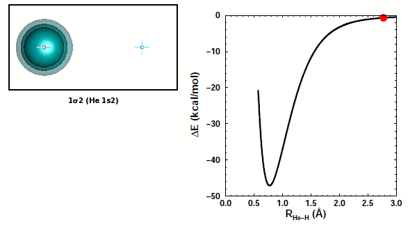 The helium hydride cation (HeH+) forms when a helium atom combines with a proton. The helium 1s2 pair becomes a shared bond pair between the two nuclei as shown in the following animation. | ||||||||||||||||||||||||||||||||||||||||||||||||||||||||||||||||||||||||||||