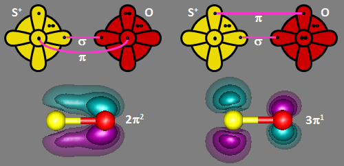 O bonds to it, there is one σ bond and one π bond, with one singly occupied orbital leftover on sulfur.