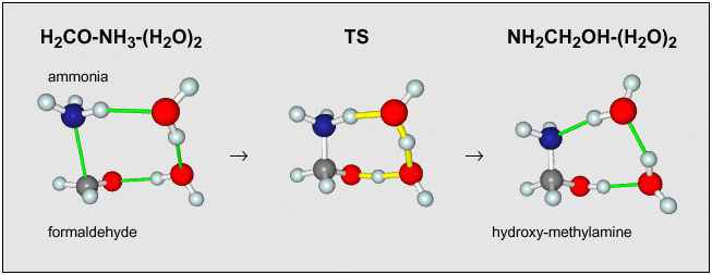One of our ongoing projects is to characterize the manner in which ice can change the behavior of chemical reactions. As an example, the reaction between ammonia and formaldehyde has a large barrier in the gas phase, much too high to be efficient at cloud temperatures of 10-20 K. But our quantum chemical calculations found that this reaction is enhanced considerably when it occurs within an ice matrix, to the extent that there is almost no barrier remaining. The water catalyzes the reaction in two ways, by directly partipating in the reaction and by generating an electrostatic field that further reduces the barrier height. |